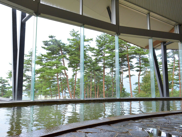 大浴場からは白鷹町が一望でき、四季の移ろいを近くに感じることができます。青空と松林が水面にやさしい色を映し、自然と一体になれるお風呂です。