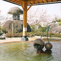 卯の花姫の湯口を備えた情緒ある天然石の露天風呂。